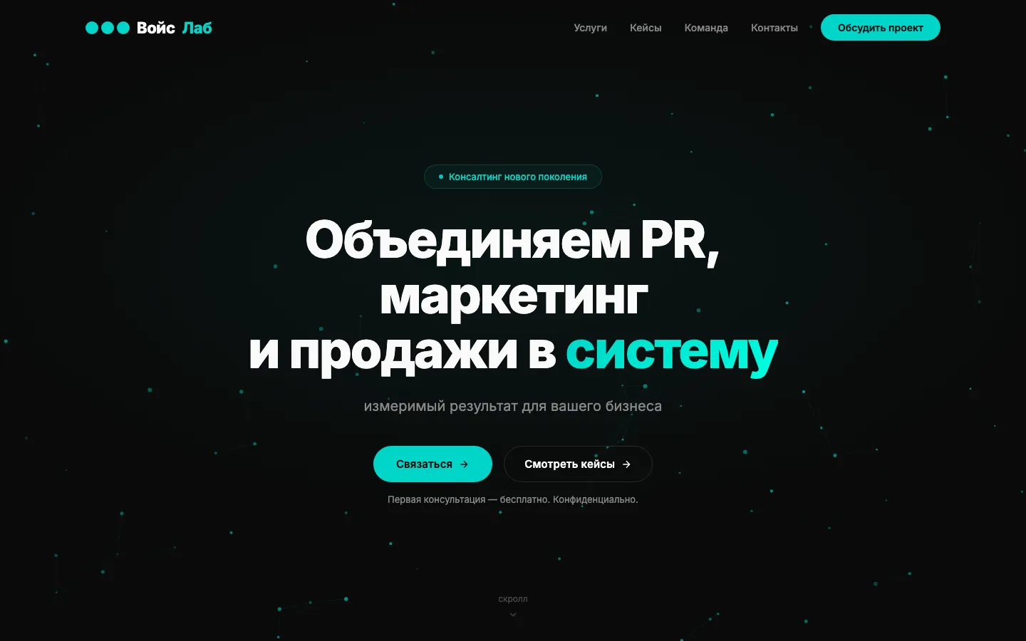 Классический PR-сайт выглядит как список услуг и убивает уникальность VOIS LAB — методологию связки четырёх направлений. Нужен был сайт-нарратив, на котором с первого экрана видно: это не «ещё одно PR-агентство», а консалтинг другого уровня.